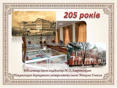 Вітаємо бібліотеку імені академіка М.О.Лавровського Ніжинського державного університету імені Миколи Гоголя із ювілеєм! 205 років це великий період історії, це час між різними епохами та століттями, через які пройшла бібліотека, зберігаючи знання, духовність, мудрість поколінь.
