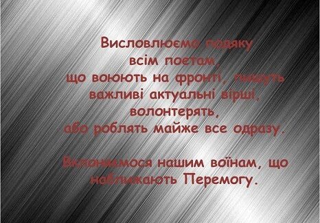 Висловлюємо подяку всім поетам, що воюють на фронті, пишуть важливі актуальні вірші, волонтерять, або роблять майже все одразу. Вклоняємося нашим воїнам, що наближають Перемогу.