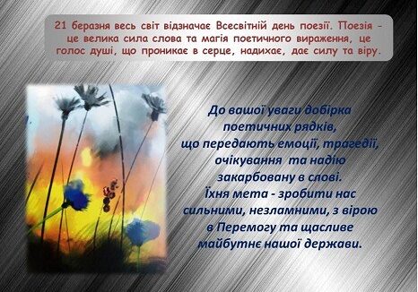 Поезія – це велика сила слова та магія поетичного вираження, це голос душі, що проникає в серце, надихає, дає силу та віру.